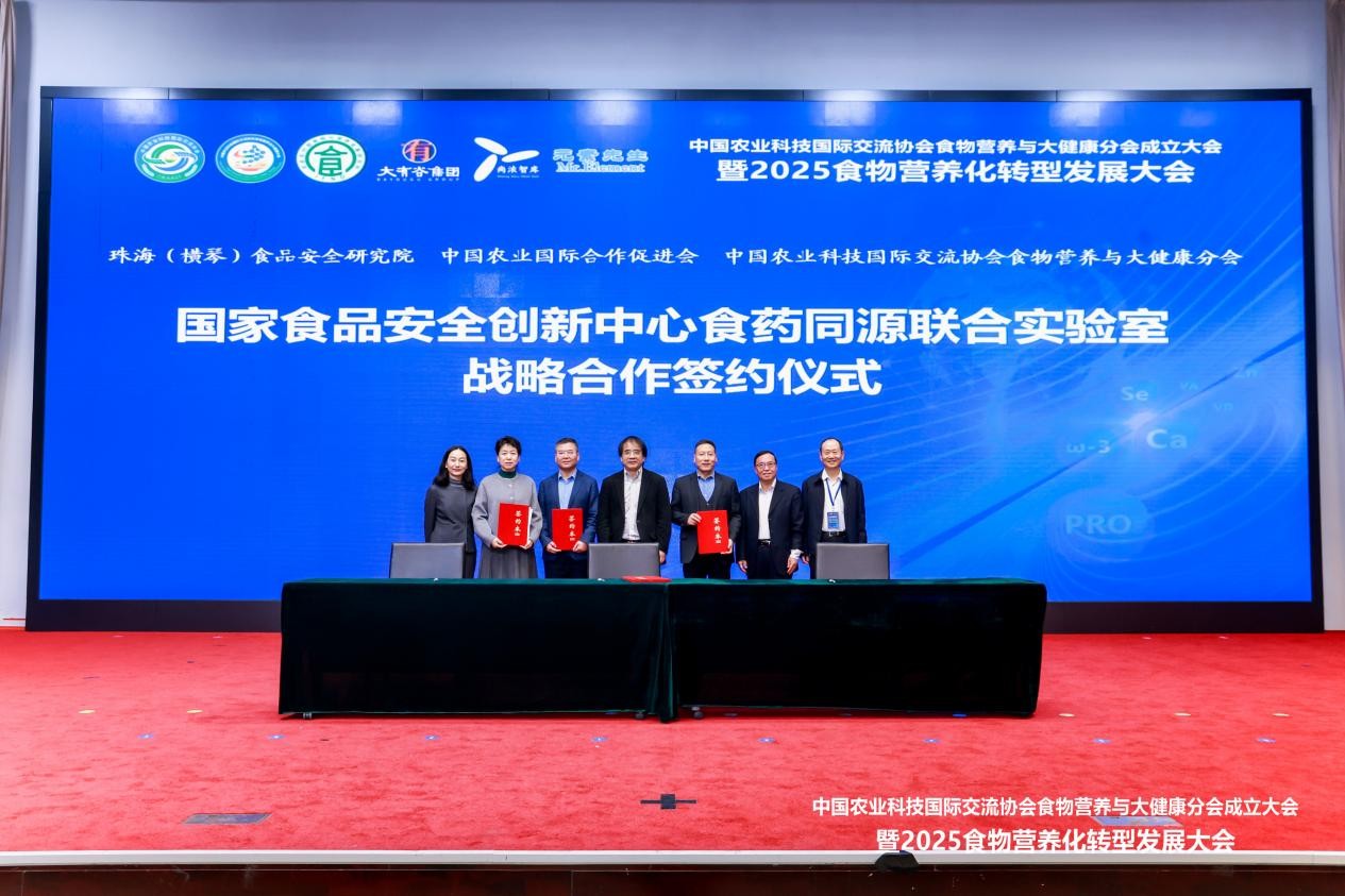 会上,由珠海(横琴)食品安全研究院、中国农业国际合作促进会、中国农业科技国际交流协会,签署了国家食品安全创新中心食药同源联合实验室共建战略协议,拟依托国家食品安全创新工程和澳门中医药科技产业载体,整合国内外高端创新资源,从技术转移转化入手构建全球食药同源产业创新平台,为企业出海提供服务支撑。会议期间举办了《中国农产品营养化转型发展报告》编制工作正式启动。该报告旨在介绍我国农产品营养化转型的前沿技术、产业模式、典型案例及政策建议,引导农业的营养健康转型。