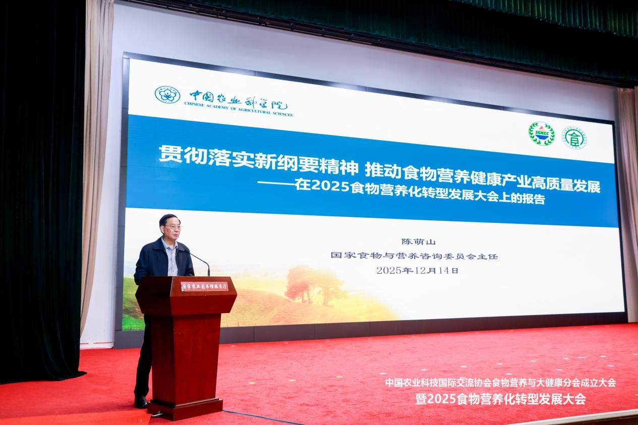 2025年12月14日,中国农业科技国际交流协会食物营养与大健康分会成立大会暨2025食物营养化转型发展大会在北京中国农业科学院国家农业图书馆报告厅隆重召开。会议以“营养转型,健康升级”为主题,深入研讨了供给端营养型农产品、营养健康食品产业发展痛点问题、消费端大健康产业发展模式与路径。